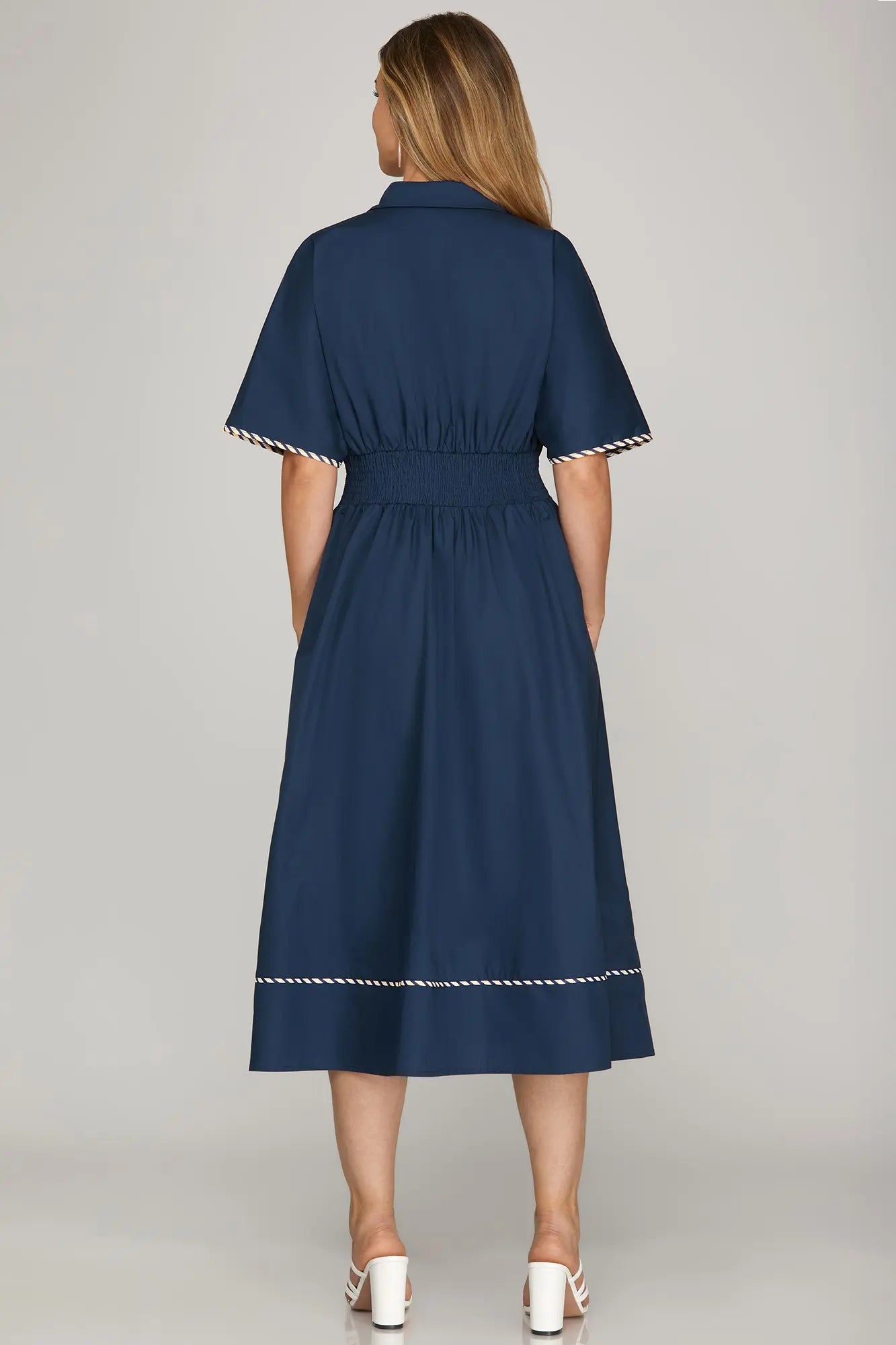 This dress is classic and sophisticated with a touch of fun! Comes in at the waist slightly for a flattering fit and functioning buttons. Work friendly