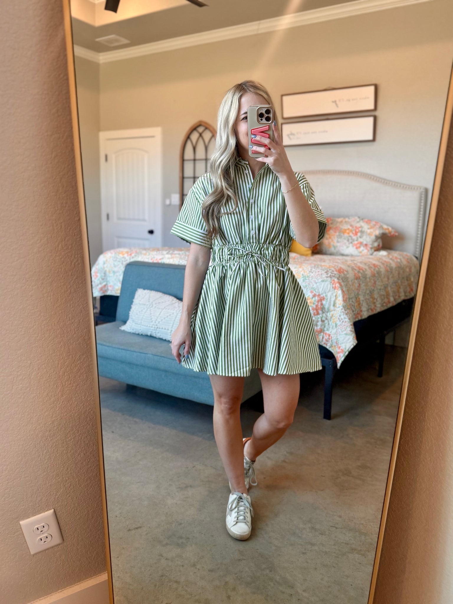 Obsessed with this one! Lightweight denim, functioning buttons to waist, smocked waist, tie, and pockets. Fits true to size