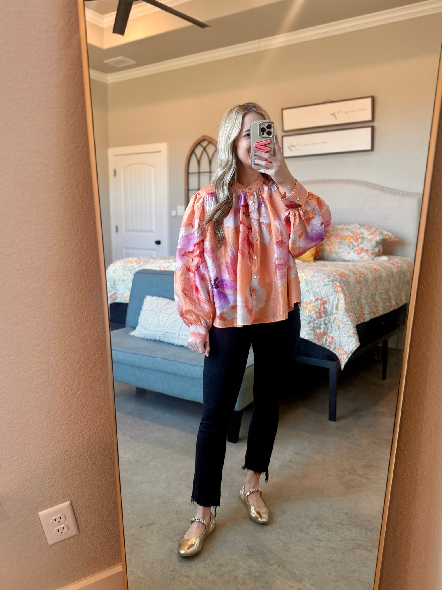 This top is a must have for your next date night or girls day! Flowy, cute print, functioning buttons, and can be dressed up or down. True to size but if between can size down